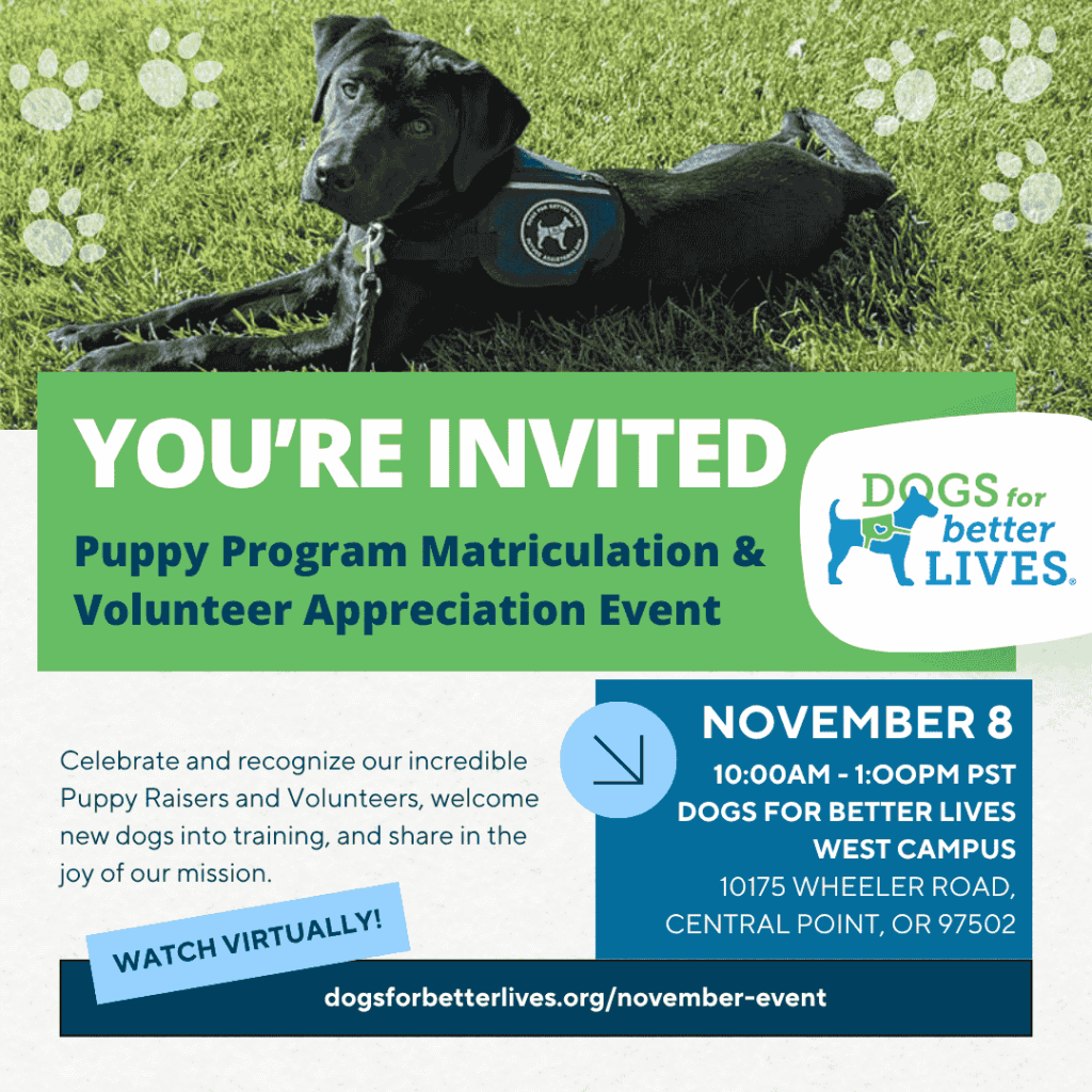 Dogs for Better Lives (DBL) invites you to join a heartfelt celebration honoring the incredible Puppy Raisers and volunteers who make our mission possible. This special event will feature an appreciation ceremony, campus tours, and the emotional “puppy turn-in” moment, when the young Assistance Dogs raised by our volunteers begin their professional training journey.