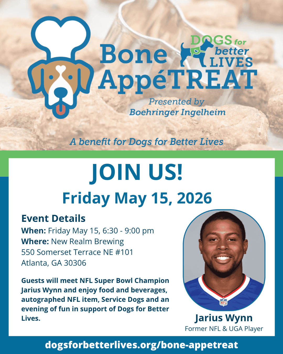 • Join me at the [CITY, STATE] watch party for Bone AppeTREAT on May 15th! Visit dogsforbetterlives.org/bone-appetreat to RSVP!