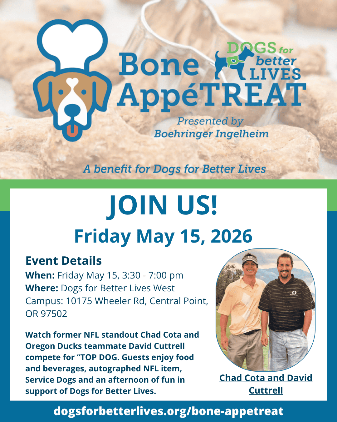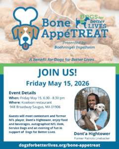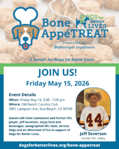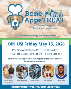 • I’m a proud (volunteer, board member, client) with Dogs for Better Lives! I hope you’ll join me in tuning in live on May 15th for Bone AppeTREAT!