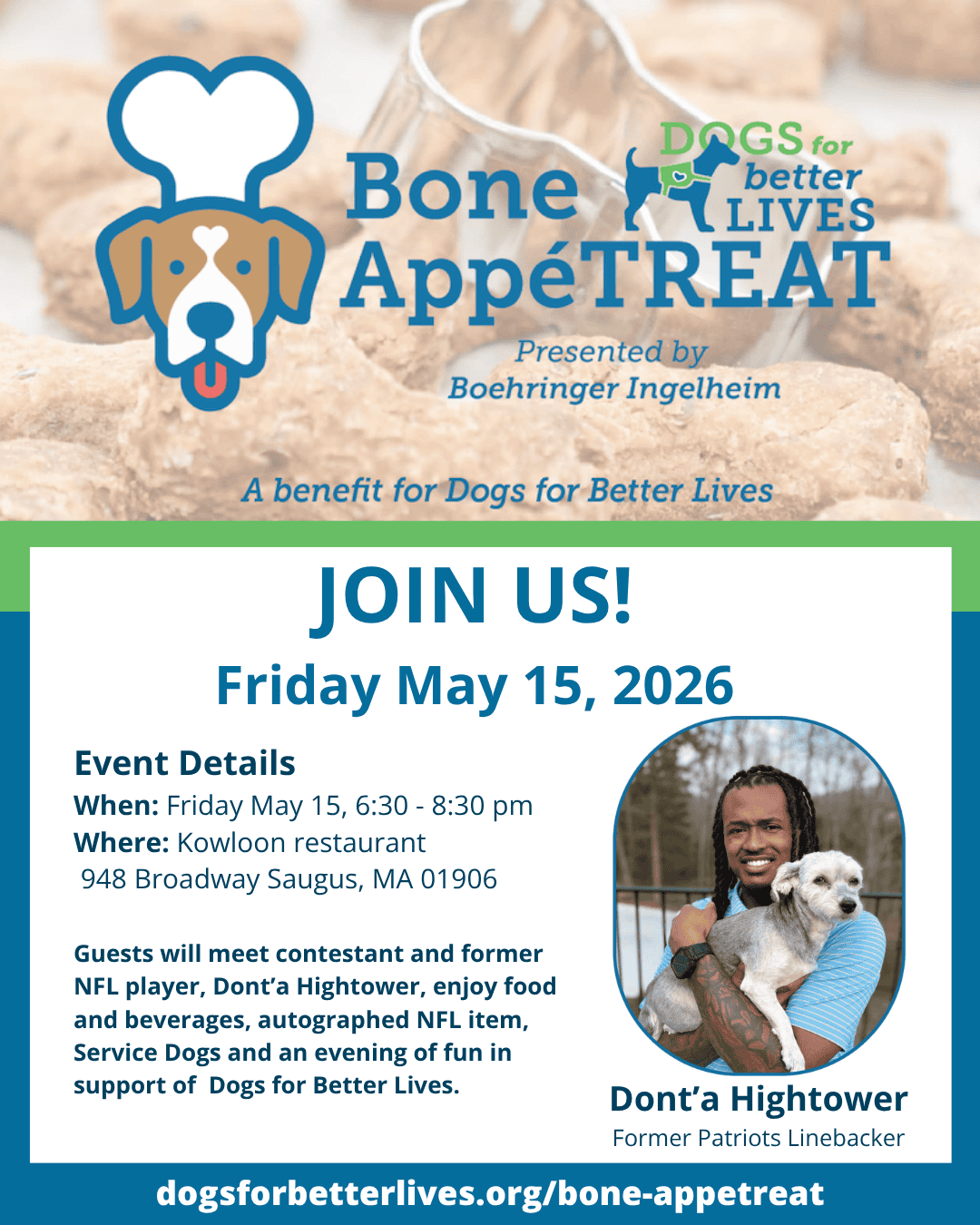 Join me on May 15 at Kowloon for the 4th Annual Bone AppeTREAT, featuring Patriots legend Dont’a Hightower!