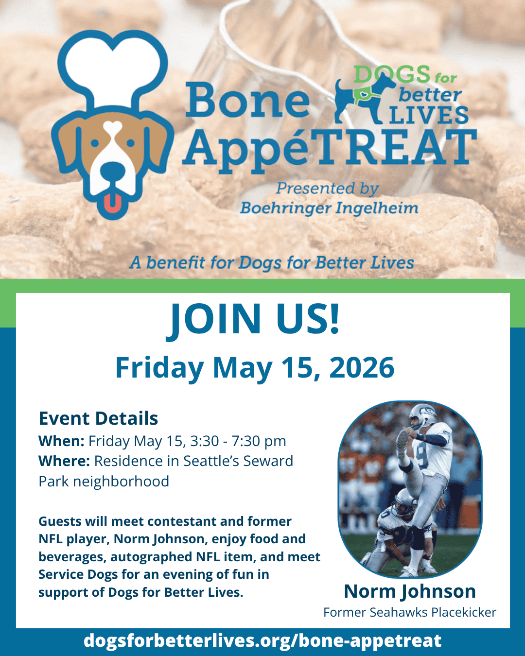 I’m excited to be part of the 4th Annual Bone AppeTREAT on May 15 in Seward Park! Join me and former Seahawks placekicker Norm Johnson for an unforgettable evening supporting Dogs for Better Lives.